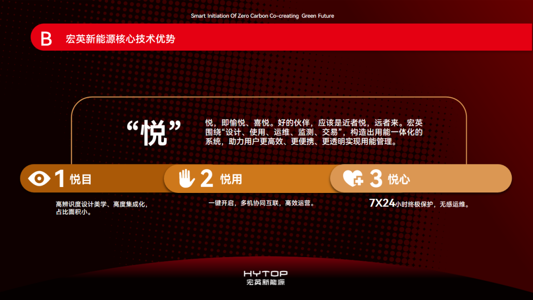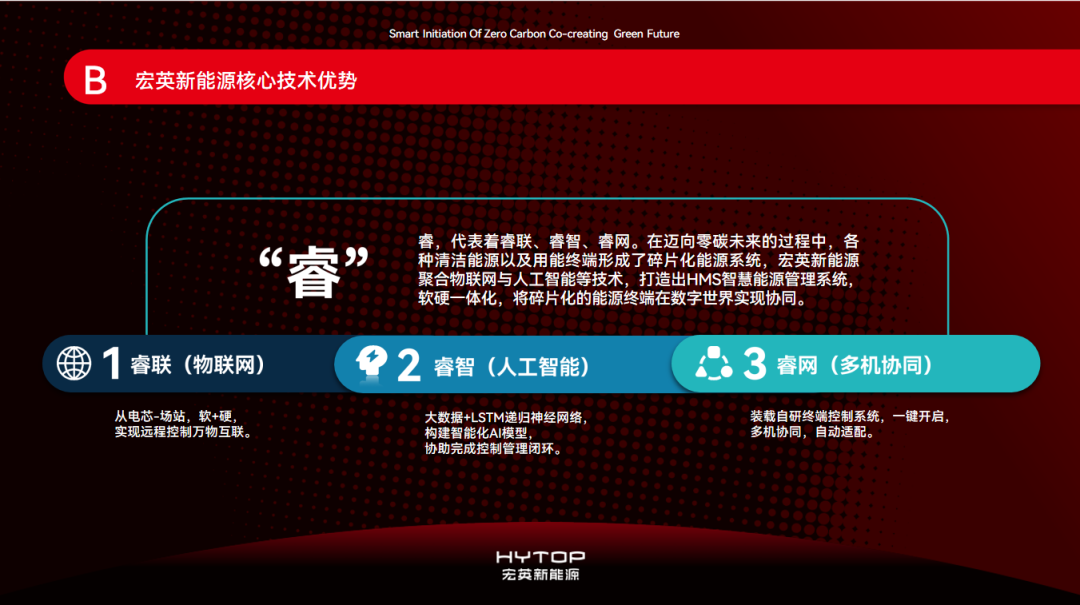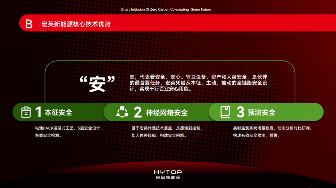 “Safety”, HYTOP realizes the safety design of the whole chain of energy storage equipment from the three dimensions of intrinsic safety, neural network safety and predictive safety. The core of HYTOP lies in the nearly 20 years of electrical and electronic intelligent manufacturing and energy management technology of its parent company. Based on the technological background, it allows HYTOP's products to help customers build a safety network, with all-around sensing and control.