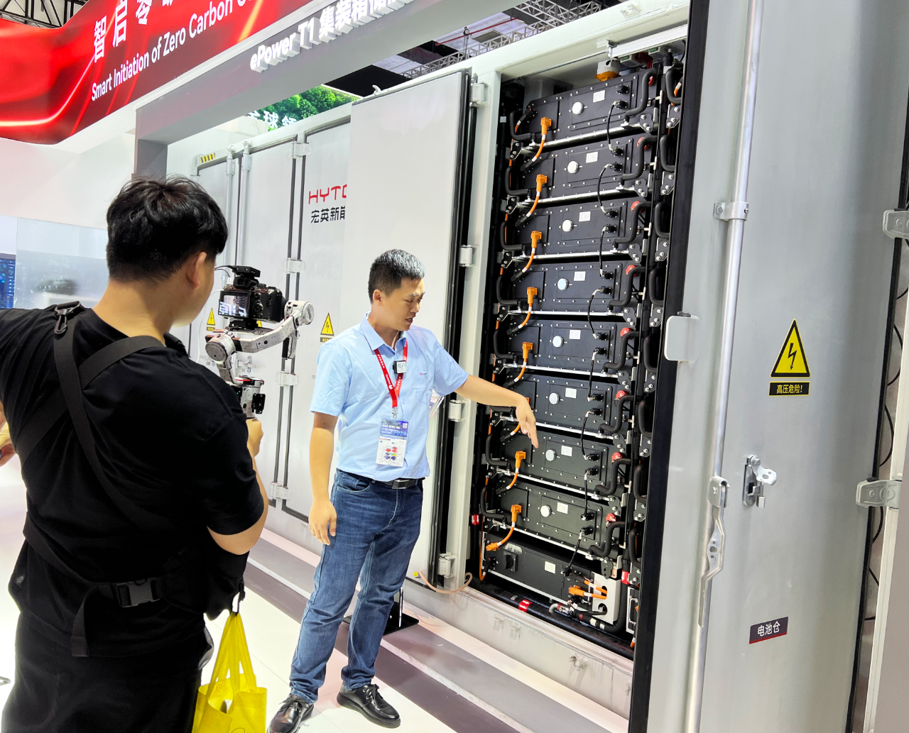 In addition, facing the international market, HY TOP New Energy has brought new upgraded energy storage products, including 5MWh container, 261kWh liquid-cooled standard cabinet and 215kWh air-cooled standard cabinet. On the scene, Mr. Huang from HY Top New Energy R&D center was interviewed by the media, stating that the products comprehensively adopt 314Ah large battery cells and further iteratively optimize the algorithm to achieve seven-day safe battery warning, and overall achieve higher integration, safety, efficiency and economy.